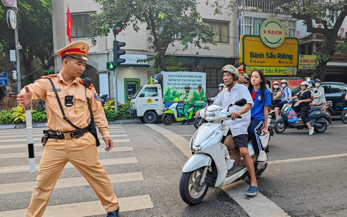Ghi nhận từ 6h30 đến 7h30 ngày 10/10, tại ngã tư Trần Hưng Đạo – Hàng Bài (phường Cửa Nam), tổ công tác Đội Cảnh sát giao thông đường bộ số 1 (Phòng Cảnh sát giao thông, Công an thành phố Hà Nội) đã lập biên bản 15 trường hợp học sinh và phụ huynh học sinh điều khiển xe máy, xe máy điện không đội mũ bảo hiểm, chở người ngồi sau không đội mũ bảo hiểm, chở quá số người quy định, xe không gương chiếu hậu, không có giấy tờ liên quan…