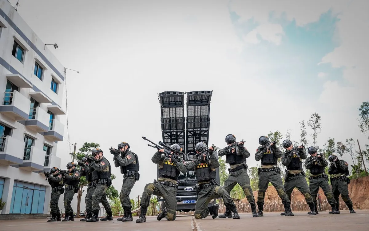 Dưới cơn mưa bất chợt, các chiến sĩ nhập vai không ngần ngại lăn xả, phối hợp cùng lá chắn chống đạn, xe bọc thép và cảnh khuyển để nhanh chóng tiếp cận mục tiêu và thực hiện một trong những nhiệm vụ thực chiến kịch tính, nguy hiểm nhất.